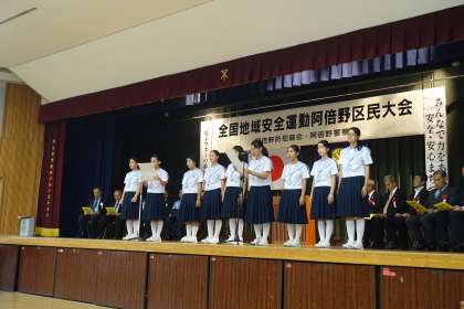 第1部では、「犯罪のない平穏で安心して暮らせるまち阿倍野」の確立を目指し、尽力してこられた本校PTA会長本庄様が防犯功労者として表彰されました。続いて、大会宣言を本校合唱部の生徒が読み上げ、大きな拍手で承認されました。