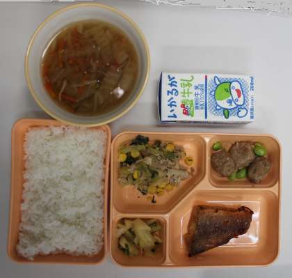10月16日(月) 給食の献立は、赤魚の中華焼き、豚肉とチンゲンサイの中華炒め、キャベツときゅうりのピリ辛あえ、鶏だんごスープ・鶏だんご・枝豆、米飯、牛乳でした。