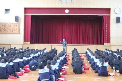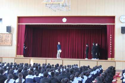 職場体験の心構えについてのお話があり、11月1日(水)に行う「あいさつ訪問」時の接遇について、学級代表のみなさんと近藤先生がお手本を見せてくれました。自然な演技が素晴らしかったです!