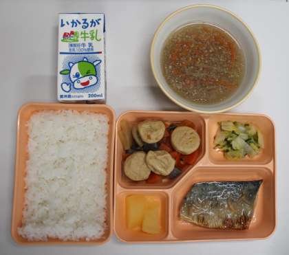 11月6日(月) 給食の献立は、鯖のみそ煮、一口がんもと野菜の煮もの、はくさいときゅうりのあえもの、りんご缶詰、吉野汁、米飯、牛乳でした。