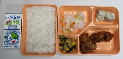 11月7日(火) 給食の献立は、油淋鶏、春雨サラダ、シューマイ、チンゲンサイとコーンの炒めもの、米飯、牛乳でした。