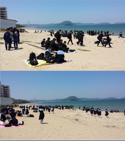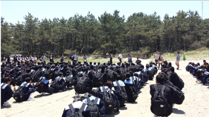 予定通り、唐津市の日本三大松原の一つ虹ノ松原に到着しました。昼食後、学級写真を撮り、体験場所へ向かいます。
