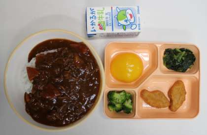 11月8日(木) 給食の献立は、ハヤシライス・ブロッコリー、チキンナゲット、小松菜のソテー、黄桃缶詰、米飯、牛乳でした。