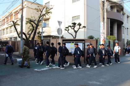 自衛隊の職業体験は、朝7時45分に学校に集合、尾添先生が付添い、大津駐屯地へバスで移動して職業体験です。どんな訓練が待っているのでしょうか…!