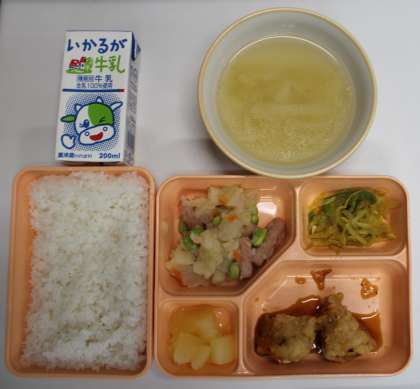 11月10日(金) 給食の献立は、鶏肉のマーマレードソース、ウインナーと野菜の洋風煮、野菜のカレー炒め、りんご缶詰、キャベツのスープ、米飯、牛乳でした。