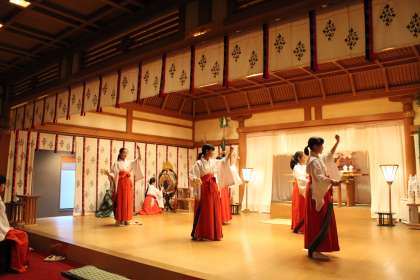 住吉大社では、住吉大社の歴史等を学び、神楽練習を行い、最後に体験学習の終了をお伝えする「修了奉告祭」を神楽殿で奉納しました。巫女さん姿がよく似合っていました。