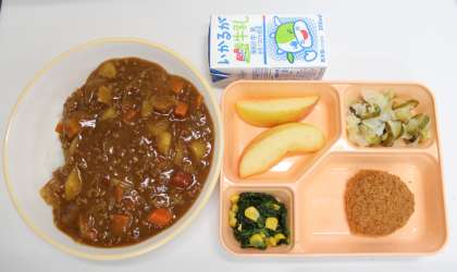 11月15日(水) 給食の紹介は、カツカレーライス・一口とんかつ、キャベツときゅうりのサラダ、ほうれん草とコーンのソテー、りんご、米飯、牛乳でした。