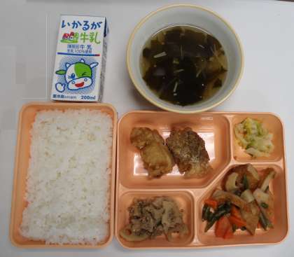 12月1日(金) 給食の献立は、鶏肉のから揚げ、赤平天とだいこんの煮もの、れんこんのきんぴら、はくさいのごまあえ、えのきたけのしょうが風味汁、米飯、牛乳でした。