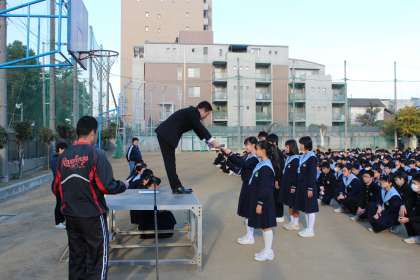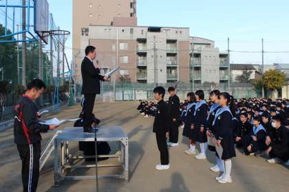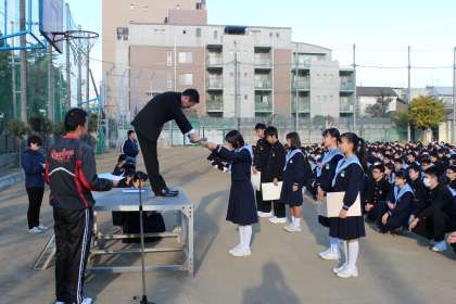 12月4日(月)朝、全校集会で、「中学生の税についての作文」で表彰された生徒及び「第295回大阪市民マラソン大会」で入賞した陸上部の生徒に、校長先生から表彰状が授与され、生徒全員から大きな拍手で祝福されました。おめでとうございます!