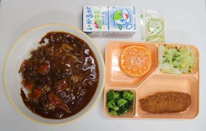 12月13日(水) 給食の献立は、ハヤシライス・ブロッコリー、白身魚フライ、コールスローサラダ、みかん、米飯、牛乳でした。