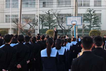 さて今日から、3年生の面接練習が始まります。今回の入試で面接試験が無い人も、これからの人生で、いろんな場面で面接を受けることになります。面接の受け方は基本的に同じなので、自分は面接試験がないからなどと思わずに、しっかりやってほしいと思います。1年生2年生も関係ないと思わずに、今日の先生の話を聞いてください。