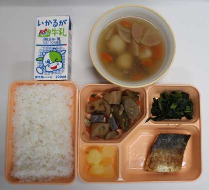 1月15日(月) 給食の献立は、鯖のみそ漬け焼き、筑前煮、ほうれん草のおかか炒め、りんご缶詰、のっぺい汁、米飯、牛乳でした。