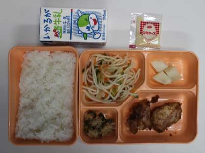 1月25日(木) 給食の献立は、鶏肉のバーベキューソース焼き、スパゲッティサラダ、粉ふきいも、ツナと野菜のソテー、米飯、牛乳でした。