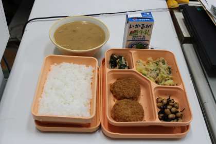 一口ヒレとんかつ・ツナと野菜の炒めもの・大豆とひじきの煮もの・ほうれん草としめじのごまあえ・うすあげとはくさいのみそ汁、です。ヒレとんかつには「とんかつソース」がついています。