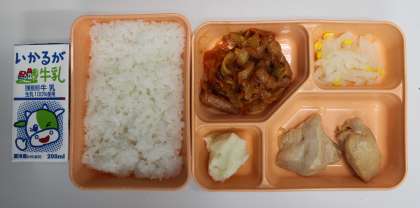 2月15日(木) 給食の献立は、マーマレードチキン、ウインナーと野菜のケチャップ煮、だいこんとコーンのサラダ、マッシュポテト、米飯、牛乳でした。