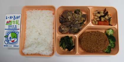 3月1日(木) 給食の献立は、コロッケ、ボイルブロッコリー、牛肉とピーマンのしょうゆ炒め、五目豆、小松菜のおひたし、米飯、牛乳でした。