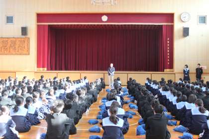集会では、米沢先生から、「いいクラスになっていますか?」あと3週間で修了式、1年生が終わりますが、いろんな場面で、学級担任をはじめ、授業する先生方、学級代表が「いいクラスにしよう」と呼びかけています。「チャイムが鳴ったら、席に座ろう」と声を掛け合ったりして、みんなにも自覚がでてきています。しゃべっていて次の授業の準備ができていなかったときは、うしろにすぐに取りに行ったりもしています。みんなで声を掛け合い「いいクラス」になっているクラスがあります。