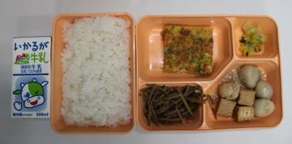 3月6日(火) 給食の献立は、千草焼き、さといもとあつあげのそぼろ煮、きんぴらごぼう、はくさいときゅうりの即席漬け、米飯、牛乳でした。
