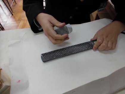 3年2組は美術です。てん刻です。中学校最後の作品の仕上げです。できあがったハンコは美術などの作品の左端に押印するときに使います。