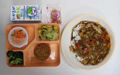 給食の献立は、【卒業祝い献立】ポークカレーライス・ブロッコリー、ミンチカツ、キャベツときゅうりのサラダ、みかんゼリー、米飯、牛乳でした。