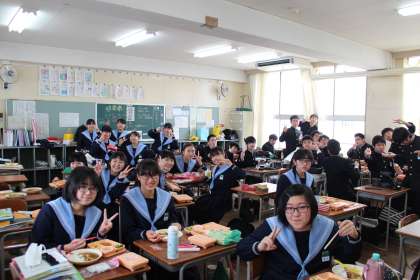 写真は、3年7組昼食時の様子です。みんなで食べる食事は、楽しそうです!