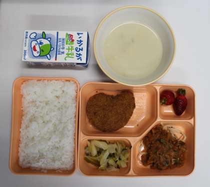 3月9日(金) 給食の献立は、チキンカツ、ミートソーススパゲッティ、キャベツのドレッシングあえ、いちご、じゃがいもとコーンのポタージュ、米飯、牛乳でした。