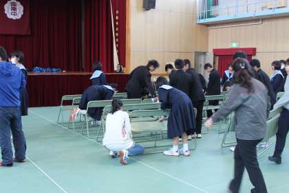 次にメジャーを基準に長椅子を起きていきます。曲がらないように、ずれないように、間隔が同じになるように、細心の注意が必要な作業です。