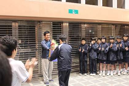 7年間顧問を務めた田村先生が転任されることになり、練習後にお別れセレモニーが開催され、花束やメッセージ入りのボールが代表生徒からプレゼントされました。最後のミーティングでは部活動ができるのは周りの支えがあってこそだから、感謝の気持ちを忘れず仲間との絆を深めてほしいというメッセージが生徒たちに送られました。