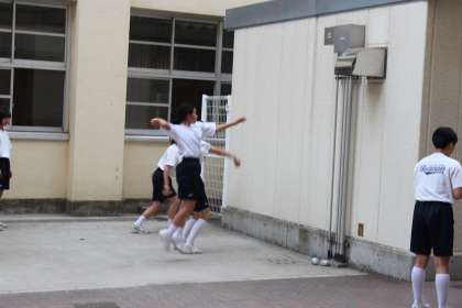 女子バレー部は配膳室の裏でスパイクの後の動き方を教えていました。