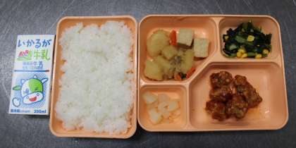 今日のメニューは、鮪のオーロラ煮・厚揚げとじゃが芋の煮物・小松菜とコーンのお浸し・大根の甘酢和えの4品とご飯・牛乳です。