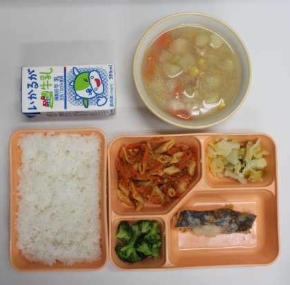 5月7日(月) 給食の献立は、チキンポトフ、ブロッコリー、白身魚のムニエル、ミートペンネ、キャベツのピクルス、米飯、牛乳でした。
