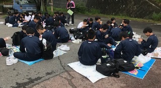 大阪府立少年自然の家に到着し、入所式を行い、昼食を食べています。