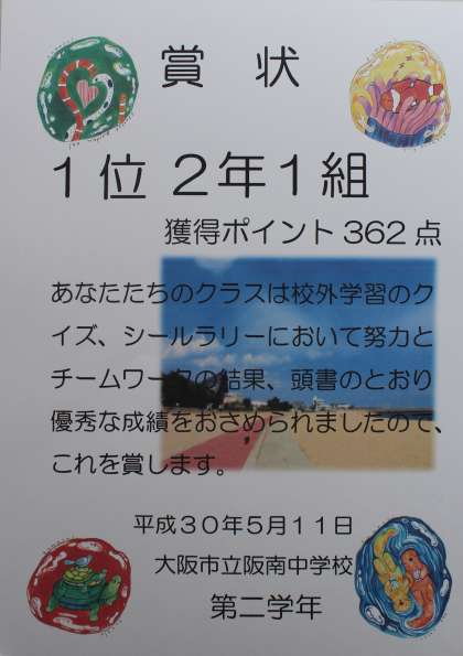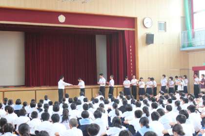 集会では、5月11日(金)に実施した須磨海浜水族園への校外学習で行った「クイズ、シールラリー」で優秀な成績を修めたクラス代表、班代表に表彰状が授与され、生徒全員から大きな拍手で祝福されました。