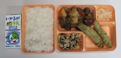 5月17日(木) 給食の献立は、肉じゃが、ししゃもの磯辺フリッター、高野豆腐のいり煮、大根の即席漬け、米飯、牛乳でした。