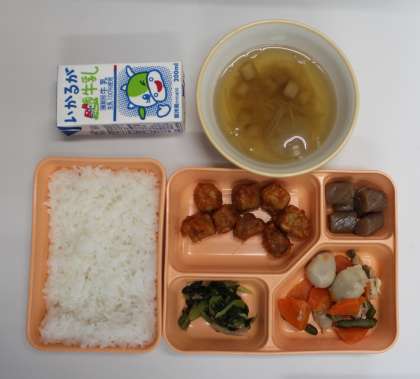5月18日(金) 給食の献立は、鮪のオーロラ煮、鶏肉と里芋の煮もの、小松菜ともやしの炒めもの、蒟蒻の甘辛炒め、麩と玉葱のすまし汁、米飯、牛乳でした。