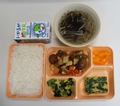 5月23日(水) 給食の献立は、肉団子の甘酢煮、にら入り卵焼き、青梗菜とコーンの炒めもの、みかん缶詰、若布ともやしのスープ、米飯、牛乳でした。