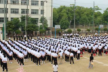 前にずらっと並んでもらっていますが、今日から6名の先生方が教育実習に来られます。なぜ、教育実習に来られるのか。これは、学校の先生になってみんなの前で授業をするためには、車を運転するために運転免許が必要なように、教員免許がいります。その免許を取るために教育実習が必要と決められているからです。塾の先生は免許がなくてもできますが、学校の先生はそういうわけにはいきません。教員免許も校種ごとに分かれていて、小学校の免許を持っていても、中学校の免許がなければ中学校で教えることはできないわけです。もちろん、中学校、高等学校は教科別ですね。
