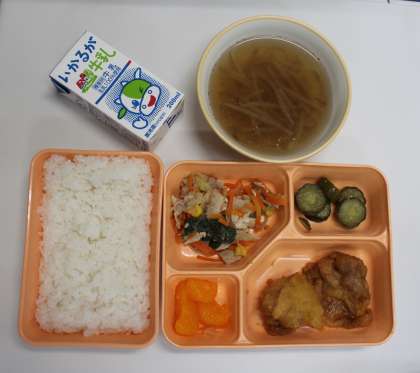 6月1日(金) 給食の献立は、油淋鶏豚肉と野菜の炒めもの、きゅうりの中華あえ、みかん缶詰、もやしの中華スープ、米飯、牛乳でした。