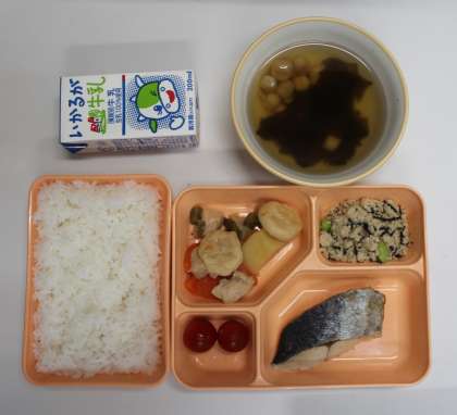 6月15日(金) 給食の献立は、さごしの塩焼き、鶏肉と一口がんもの煮もの、高野豆腐の炒り煮、プチトマト、麩と若布のすまし汁、米飯、牛乳でした。