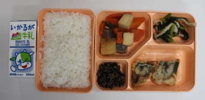 7月3日(火) 給食の献立は、鯵のてんぷら、あつあげとこんにゃくの煮もの、小松菜としめじのあえもの、牛ひじきそぼろ、米飯、牛乳でした。
