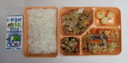 今日の給食は北海道の料理でまとめています。白身魚のちゃんちゃん焼き風・豚肉の炒め煮・揚げポテトもち・五目豆・米飯・牛乳です。