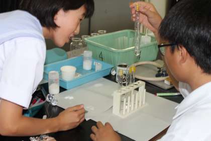 理科の実験です。 3種類の白い粉を水に溶かしてその溶け方の違いを調べています。