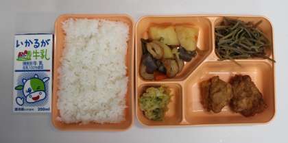 7月10日(火) 給食の献立は、鶏肉のごま揚げ、ちくわとじゃがいもの煮もの、ごぼうとピーマンのきんぴら、キャベツのしょうがじょうゆあえ、米飯、牛乳でした。