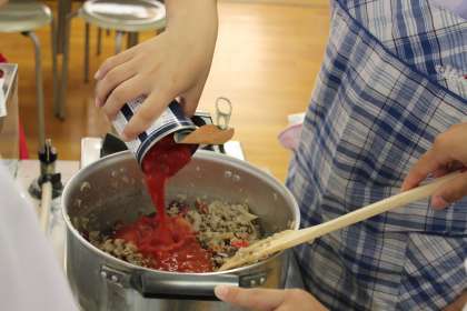 7 Put everything into a pot. Add the beans,tomatoes,cumin,oregano,chill powder and salt.