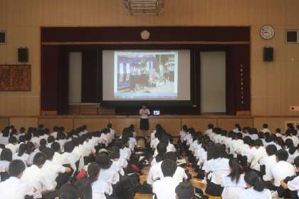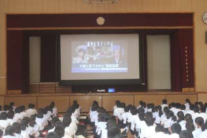 最後に、生徒会長が追悼式で発表した平和についてのスピーチ「平和への決意」を聞きました。平和の大切さを確認するとともに戦争のない世の中を作ることを誓いました。