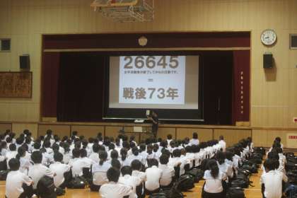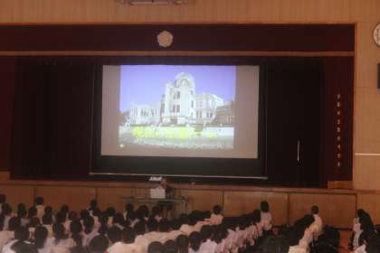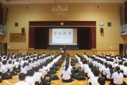 8月7日(火)朝、1年生は体育館で「平和学習」として、「戦争の悲惨さ」「平和の尊さ」「反戦平和」について、暑い体育館でしたが、途中吸水タイムを取りながら学びました。
