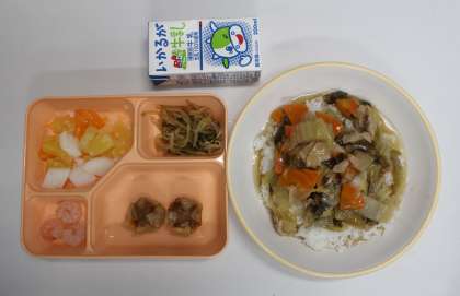 9月5日(水) 給食の献立は、中華丼・えび、揚げシューマイ、もやしのピリ辛あえ、杏仁豆腐、米飯、牛乳でした。
