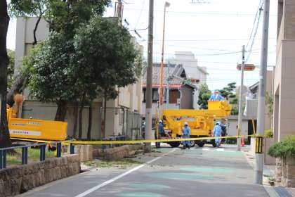 交番横のグリーンロード入口は通行止め、送電もストップ。交番と近隣のマンションはこの3日間ずっと停電だったと聞いています。