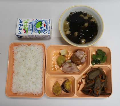 9月7日(金) 給食の献立は、鶏肉のてり焼き、牛挽肉とごぼうの炒め煮、さつまいものから揚げ、オクラのおひたし、すまし汁、米飯、牛乳でした。