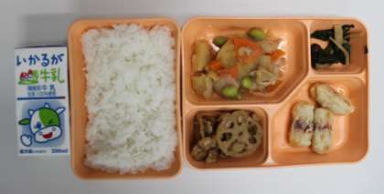 9月18日(火) 給食の献立は、豚じゃが、ちくわのてんぷら、五目豆、ほうれん草としめじのあえもの、米飯、牛乳でした。